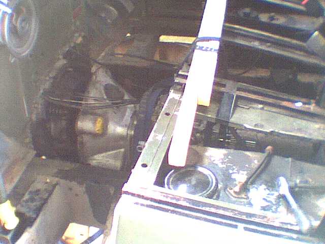 Now for the main gearbox. Having removed all the bellhousing nuts (I missed one the first time round) it's time to start wriggling it free. The back of the engine is supported on a block of wood shoved between the flywheel housing and the chassis. Out of shot here is a trolley jack underneath the gearbox, just helping to take some of the load. It turned out to be helpful during the inital shuffle away from the engine, but after that the box was easy enough to handle without it.