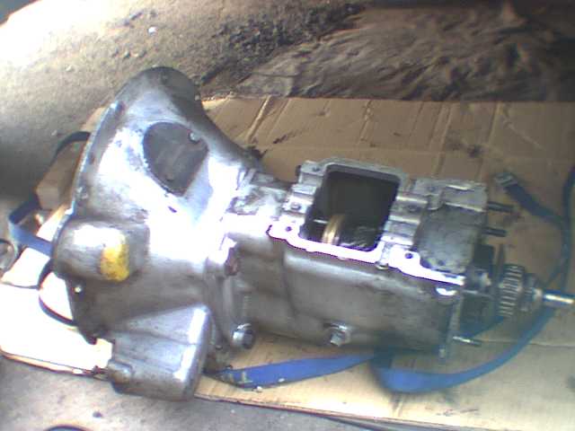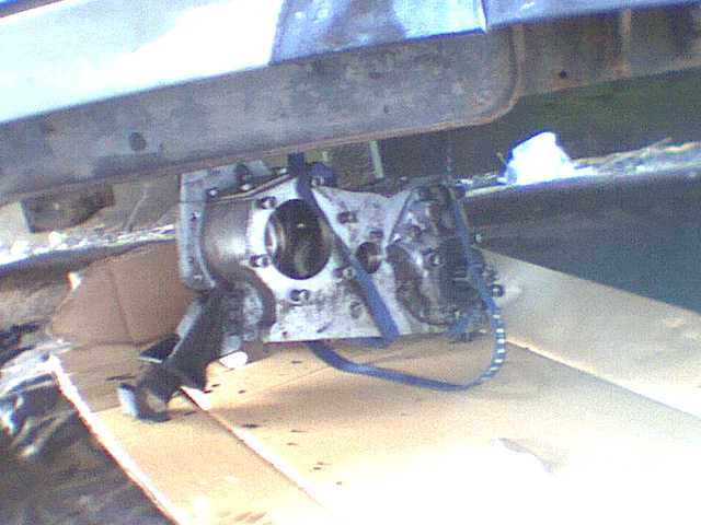 A little more lowering and the transfer box is out, on a handy piece of thick cardboard which works as a sort of skid for moving it, and also keeps it reasonably clean.