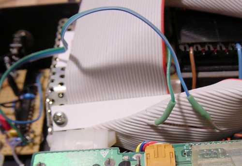 Here's a picture of how I attacked the ribbon cable with a sharp knife and brought the wires out to the circuit (out of focus in the background).