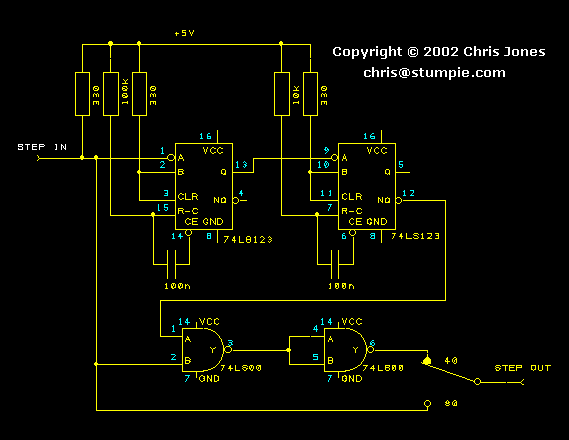 All it does is take the step pulses on pin 20 of the disc drive ribbon cable and create another one shortly after each pulse by means of the two monostables. The original pulses and the extra ones are then combined in the gates and fed to the drive. The resulting pulse train isn't perfectly even, so the drive sounds a bit odd when it seeks, but it works.
