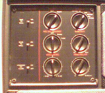 Here's a closeup of the controls. The switches down the left hand side are marked "side to wall", "rear to wall", and "standing on floor", and adjust the bass response for different room positions. The other controls, from the top left, are: