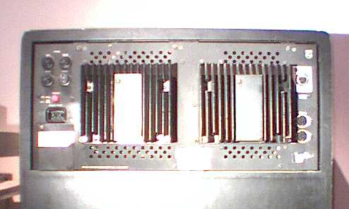 Here's a rear view. This is just the top quarter or so of the cabinet. Notice the mains inlet (an unusual 2-pin connector), power switch and fuses on the left hand side, the generous heatsinks in the middle, and the audio inputs on the right. There's a female XLR connector at the top for the balanced input and a pair of 5-pin DIN sockets for the daisy-chainable unbalanced input. I've seen another photo of a 545 which had phono sockets instead of DIN ones.
