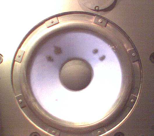 And that thumping great woofer, with its large rolled rubber surround. Notice especially the two sets of leadout wires in the cone: one for driving it, and one for the motional feedback.