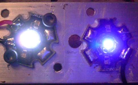 The colour contrast is quite obvious: the one with no phosphor gives out a rather nice colour of blue light. I don't suppose it'll last long, open to the elements like that, though. Hopefully this page will satisfy the curiosity of anyone who might be tempted to pull one apart and save them an expensive experiment!